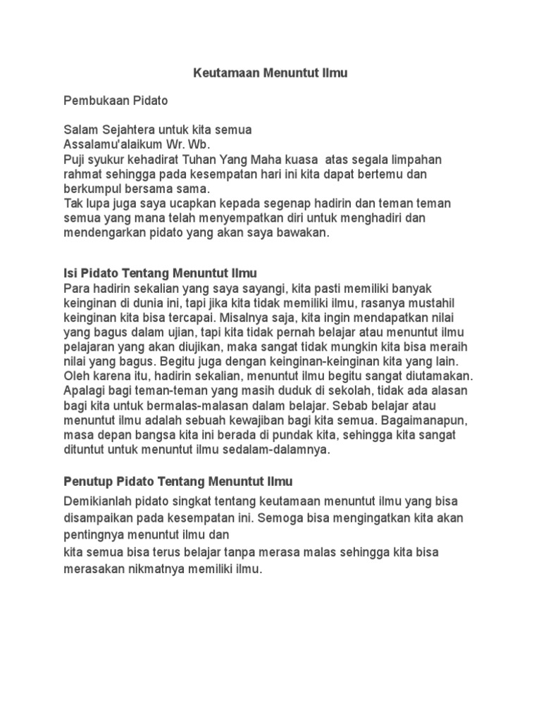 Public Speaking NegotiationDosen Pengampu. Pidato bahasa inggris ini adalah pidato singkat dan mudah dipelajari. Contoh Pidato Tentang Menuntut Ilmu Terbaru Kumplan Pidato.
